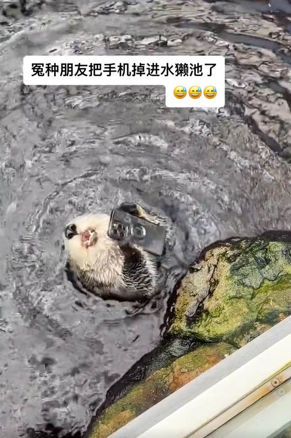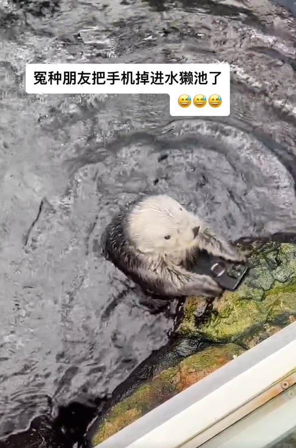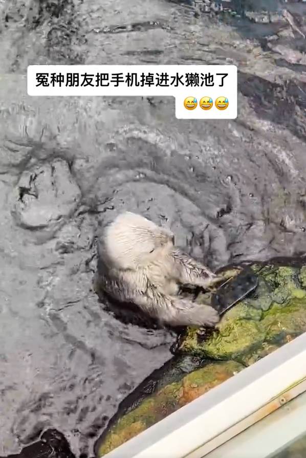 海獺的習性就是會用巖石敲開貝類的殼,日前有位微博網友和友人到動物園遊玩時,朋友不小心讓手機掉落進海獺池,沒想到海獺竟誤將手機當作蚌殼,拿起來在石頭上猛烈敲打,讓手機主人的心也跟著碎了…