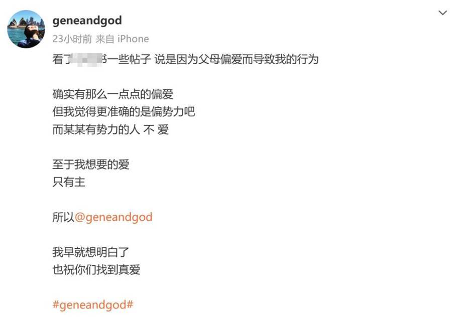 孫燕姿妹妹認為準確說法是父母偏愛勢力的一方,覺得不被父母偏愛是不如姐姐優秀。ADVERTISEMENT 而某某有勢力的人不愛,根據她的行文習慣,這里的某某指的就是孫燕姿,間接說明孫燕姿不愛妹妹。同時,也再次表示已經想明白,也不渴望從父母及姐姐那里獲得自己想要的愛。