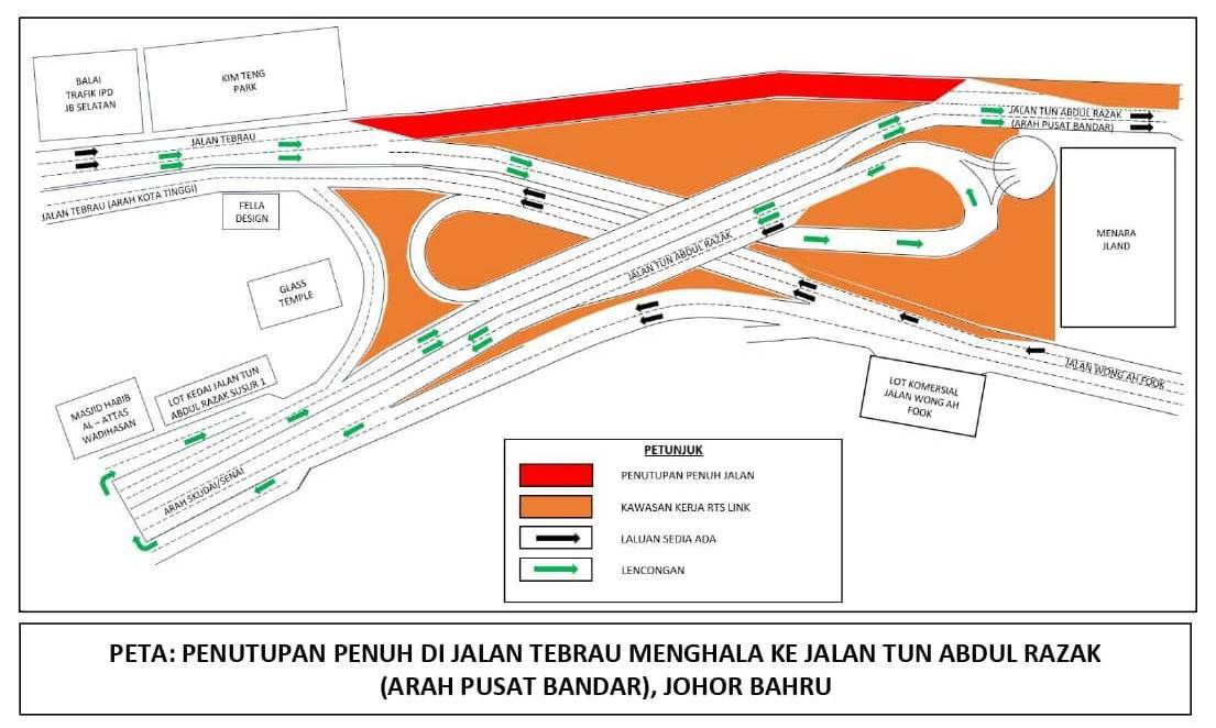 配合如火如荼的新柔捷運系統(RTS)工程,從12月27日起至2024年6月27日,地不佬路前往新山市區的路段,全面封閉,不得通行。