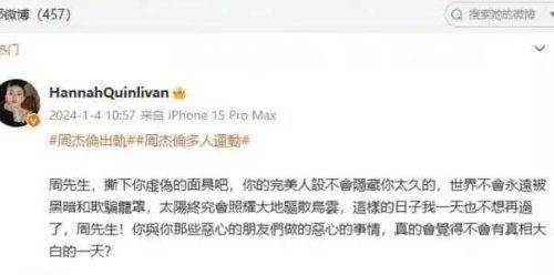 4日早上,微博瘋傳一個看似昆凌的賬號的發文,開頭就先Hashtag #周杰倫出軌 和 #周杰倫多人運動,接著洋洋灑灑寫出周杰倫的「惡行」,無情開撕說他虛偽,稱他的完美人設會被揭穿。