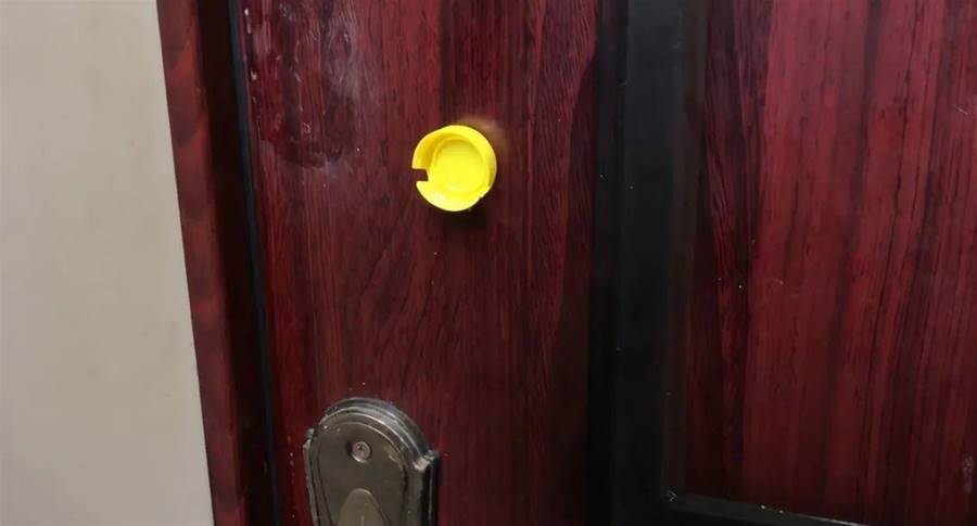 第三步,最后我們就可以把改造好的塑料瓶蓋粘在家里的門上了,最好粘在門把手的上方不遠處