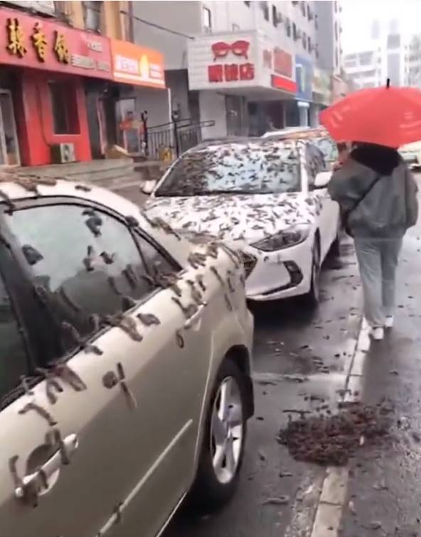 影片中可以看到,停在街道上的車輛不管是車頂、引擎蓋還是擋風玻璃上通通都是這種黑色的條狀物體,數量還多到掉落在馬路上,報導也指出當地居民被建議出門要帶雨傘,避免被墜落的物體打中。