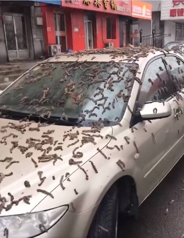 中國北京近日一段「蟲雨」的影片在網路上掀起熱議,畫面中只見路旁的車輛完全被蓋上一層密密麻麻的條狀物,驚悚的景象讓不少有密集恐懼癥的網友都雞皮疙瘩掉滿地,不過當地人指出那一條一條的東西其實不是蟲,一切都是誤會!