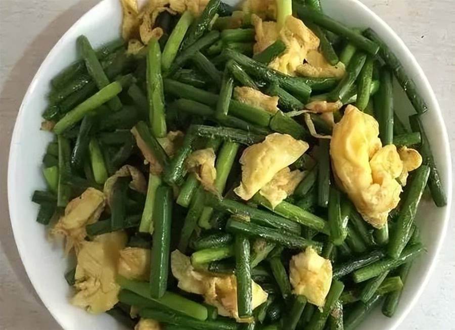 5.將炒好的蒜薹炒雞蛋裝盤,趁熱食用。
