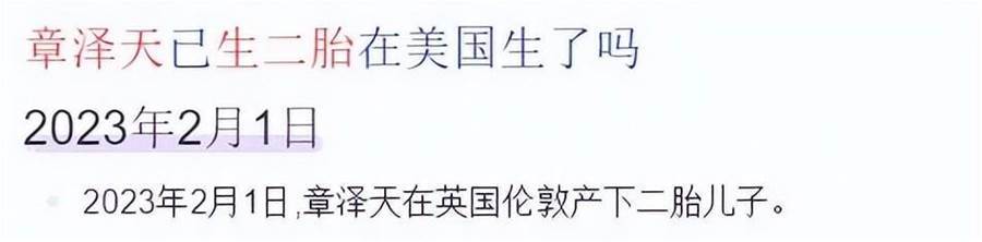 章澤天是2022年9月,章澤天宣布懷二胎;2023年2月1日,在英國倫敦產下二胎兒子。但產子后,章澤天將兒子保護得很好,幾乎沒有被拍到。不過12月26日,有網友在倫敦偶遇章澤天,她罕見帶著雙胞胎兒子現身公園看表演。