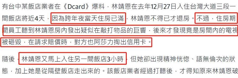 被酒店趕出來之后,林靖恩又找一家酒店入住,結果因為她舉止異常,另一家酒店得知她的打砸行為之后再次要求她離店。