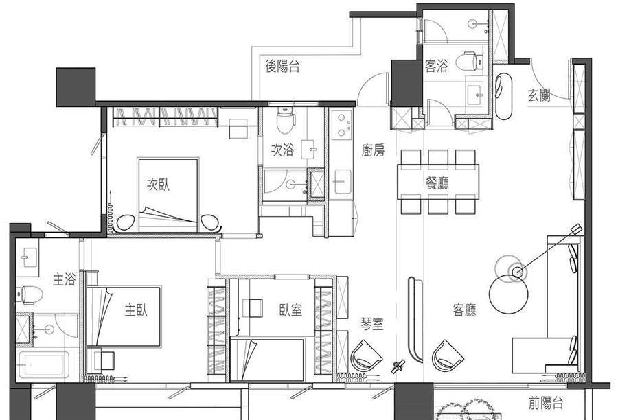 這套使用面積為40坪的三房兩廳戶型相當不錯,采用現代簡約風格進行裝修。整體以珍珠銀白為基調,巧妙地融入音樂元素,打造出獨具個性的居住空間。