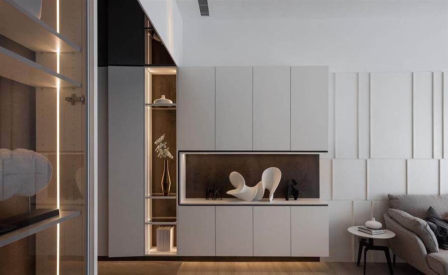 玄關設計沉穩大氣,巧妙運用鏡面元素,有效提升空間感,優化視覺體驗,并巧妙化解了入戶橫梁的壓抑感。落塵區則選用灰色地磚,與懸浮式柜體及嵌入式燈條相得益彰,共同勾勒出明亮的線條,讓回家的過程充滿儀式感。