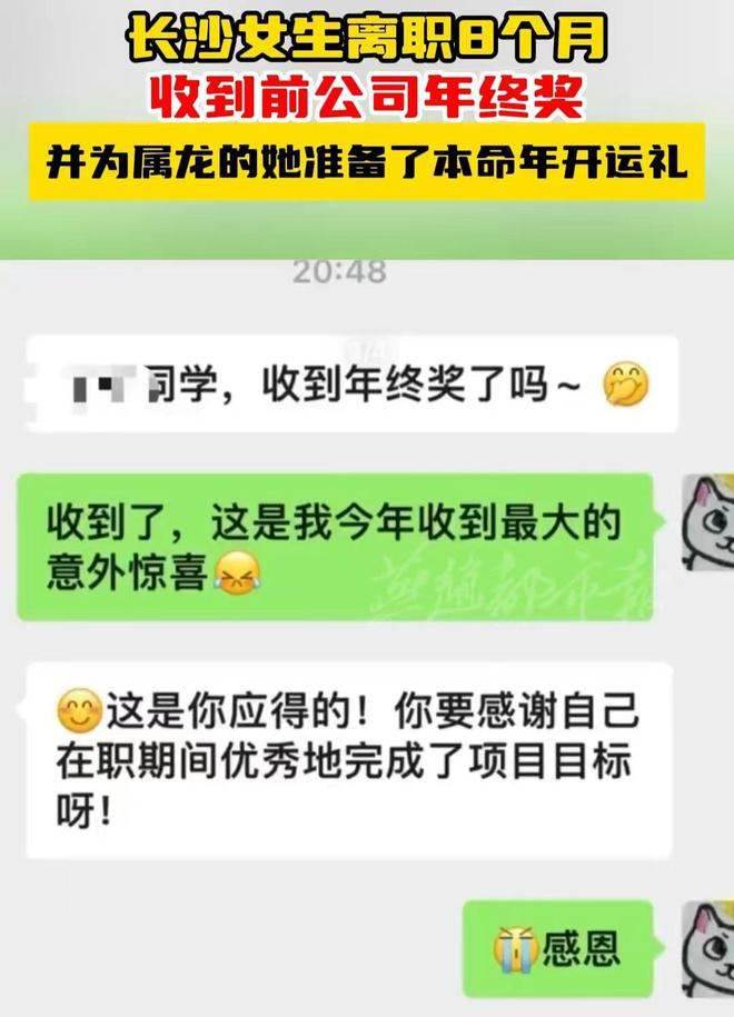 大家都知道只要辭職了,能夠拿到基本的工資已經很好了,但中國長沙一名女子卻在辭職8個月后,還收到前公司發來的年終獎,這讓她感到驚訝萬分!