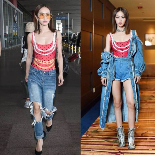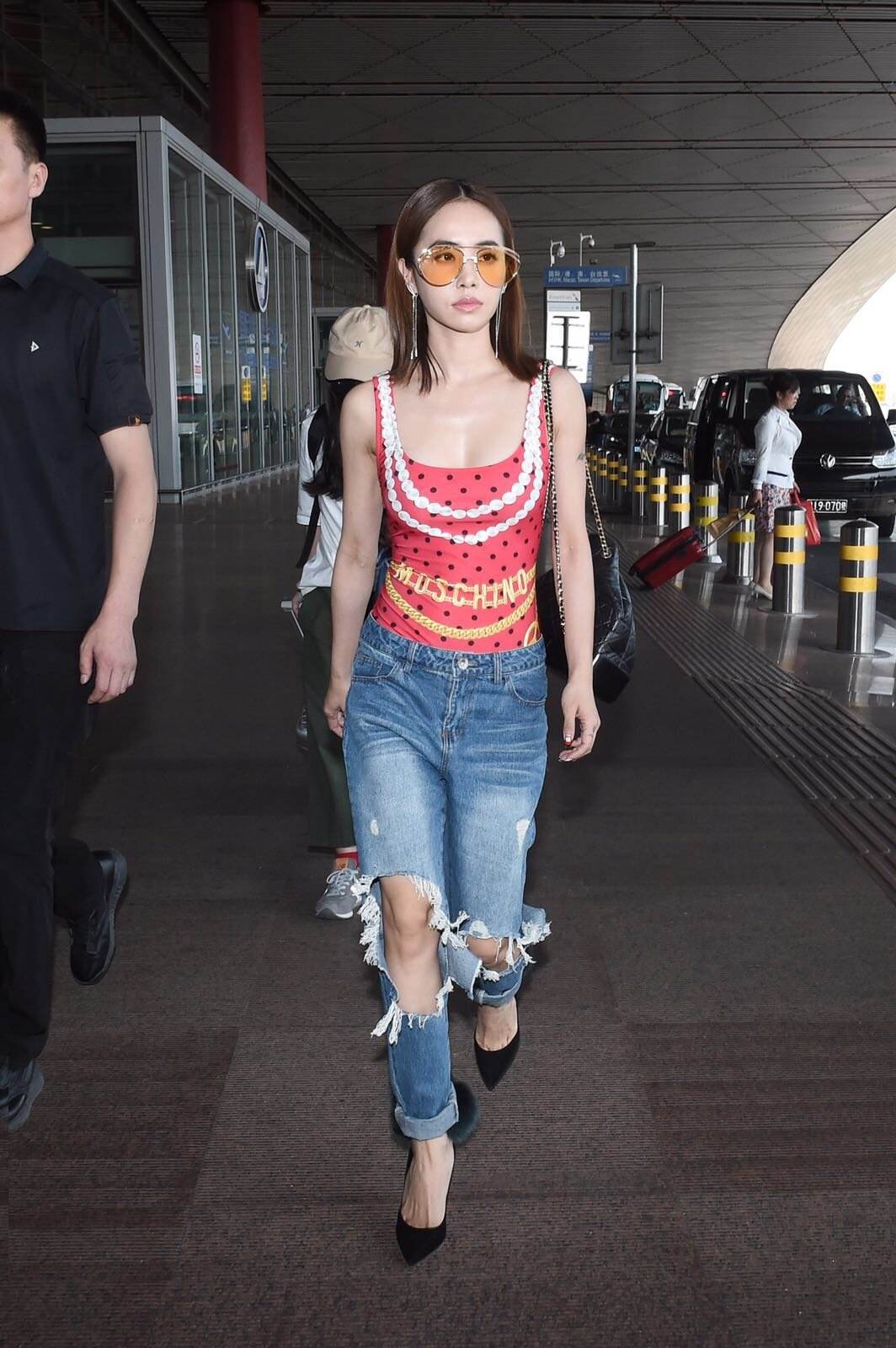 首先,蔡依林曾在機場被拍到穿著MOSCHINO春夏連身款泳裝,內搭牛仔破褲和JIMMY CHOO毛球高跟鞋,再配上本季最時髦的淺色太陽眼鏡,完美展現了她的時尚品味。
