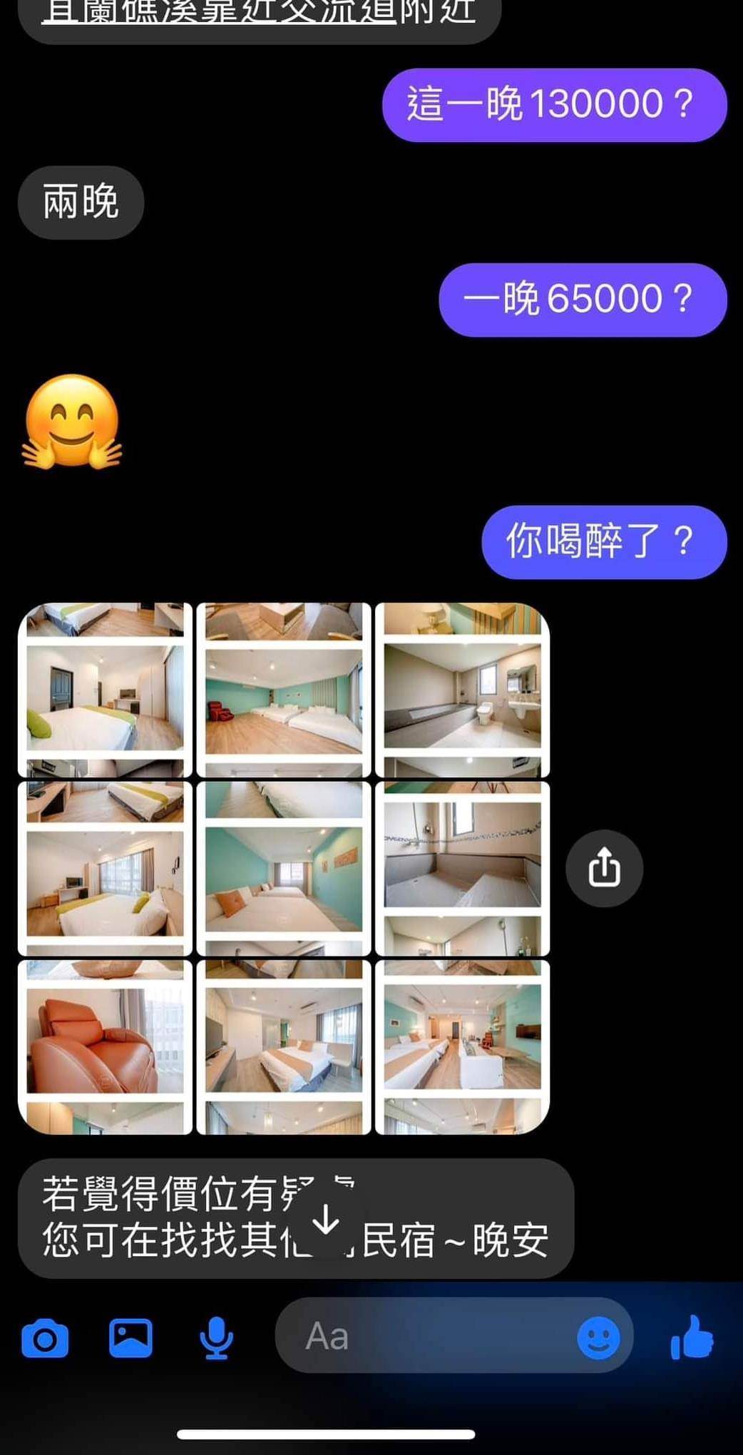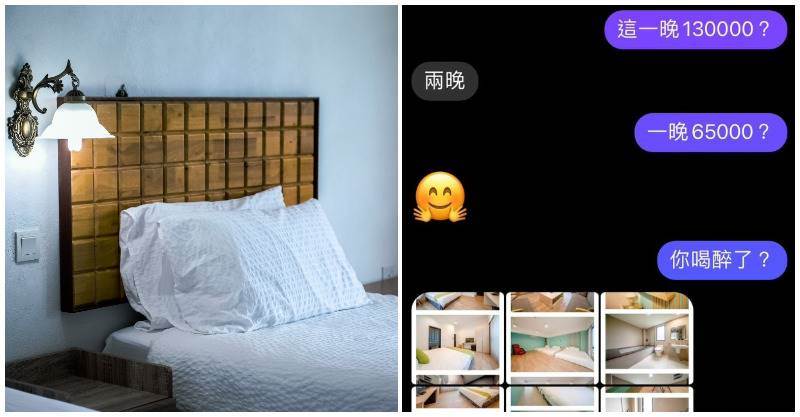 原PO貼出與民宿業者的對話,表示日前他上網要找跨年住的民宿,卻看到疑似有民宿業者趁機哄抬價錢,立馬私訊那間宜蘭礁溪包棟民宿說:「這一晚13萬元?」對方回說:「兩晚」,原PO再繼續回:「一晚6萬5?你喝醉了?」