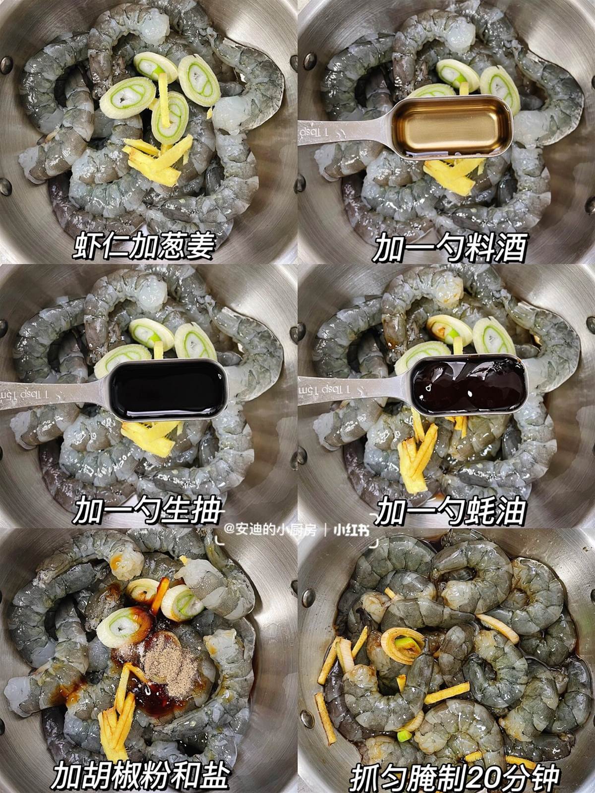 ?大蝦去殼去蝦線取出蝦仁+一勺料酒+一點胡椒粉拌勻腌20分鐘