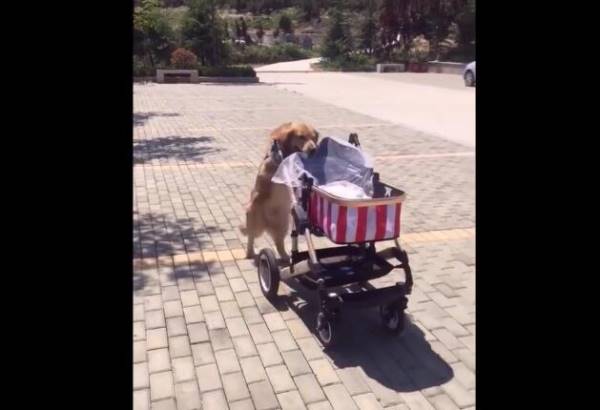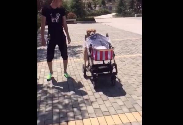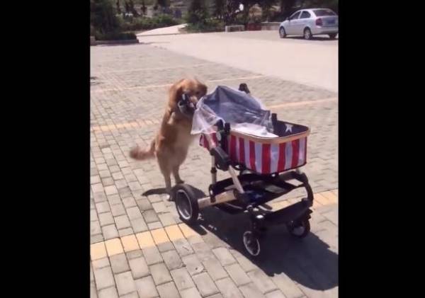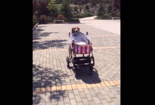 男主人帶著寶寶和狗狗一起出去外面散步,接著男主人假裝不要寶寶了,而狗狗卻出現這樣的一個行為,看它自己推著小寶寶的車子,一步步往家裡面走。