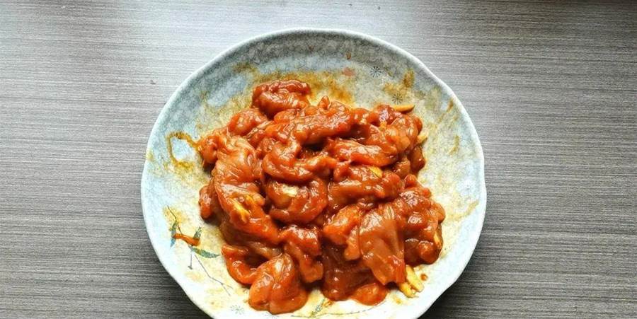 3,洗凈的瘦肉切成薄片,加適量的姜絲、生抽、老抽、花椒粉、淀粉,打入一顆蛋清,抓拌均勻,腌制15分鐘。