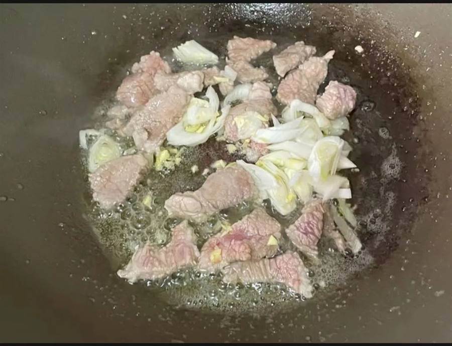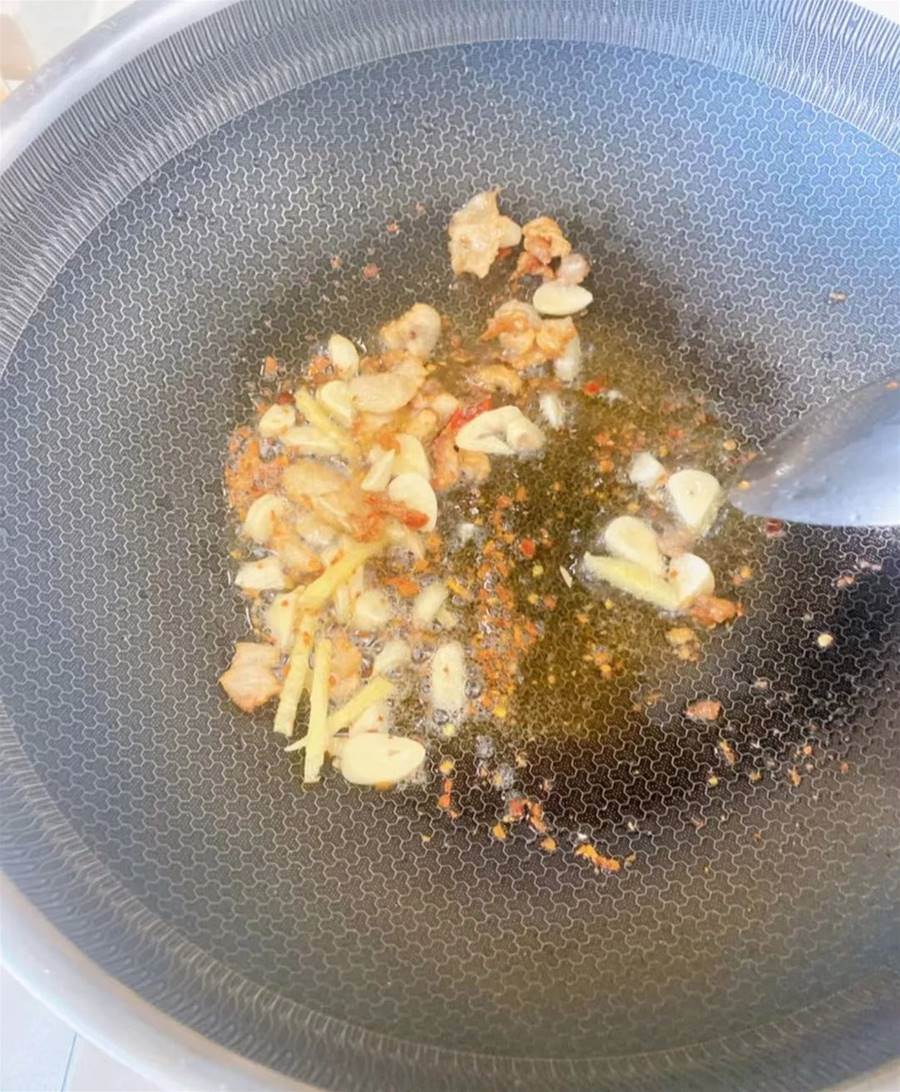 4.煸炒小料:然后下入蔥姜蒜、干辣椒、八角,煸炒一會,炒出香味。