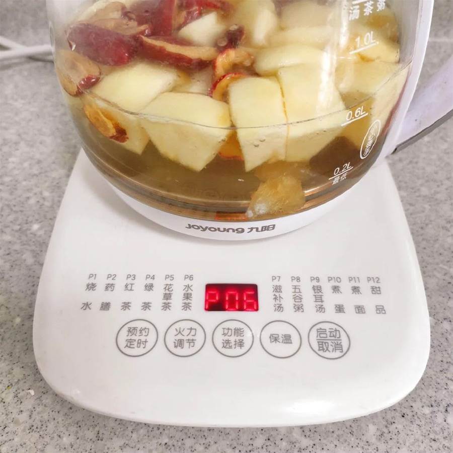 蘋果去皮切小塊,紅棗去核,把所有的食材清洗干凈,放入養生壺加水煮20分鐘就可以喝了。
