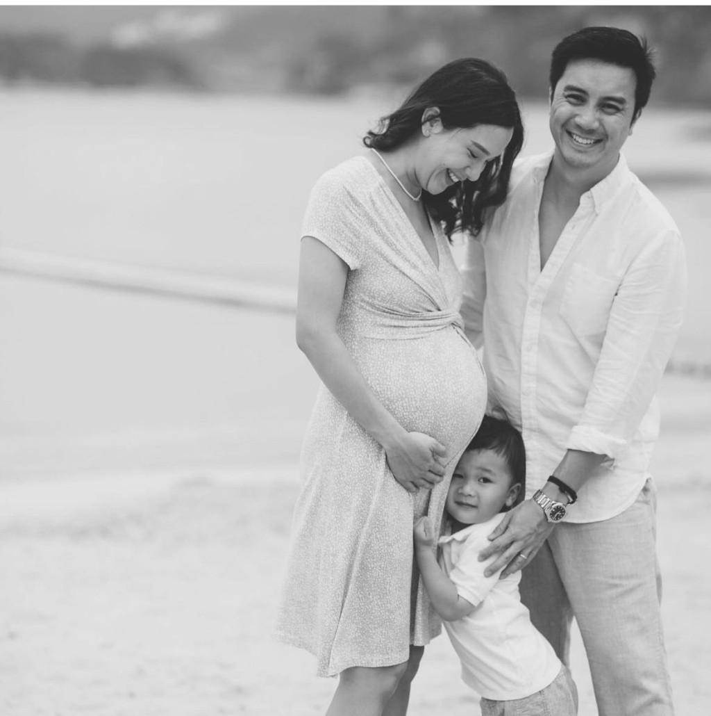 照片中所見,一家三口特別到沙灘拍攝家庭照,兩公婆坐在大樹下互相依偎,張介榮更從后環抱太太的孕肚,李文琪緊閉雙眼流露出幸福笑容;另一張換上貼身長裙照,可見李文琪孕肚已經大如籮,上圍亦明顯升Cup不少,其間,兩歲多Declan又不時靠在媽媽的肚皮,看來即將榮升哥哥的他也很期待寶寶的來臨。