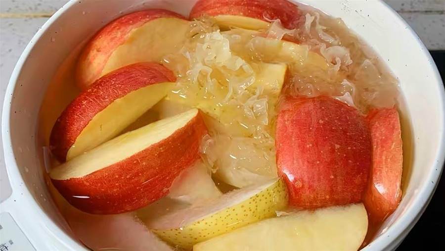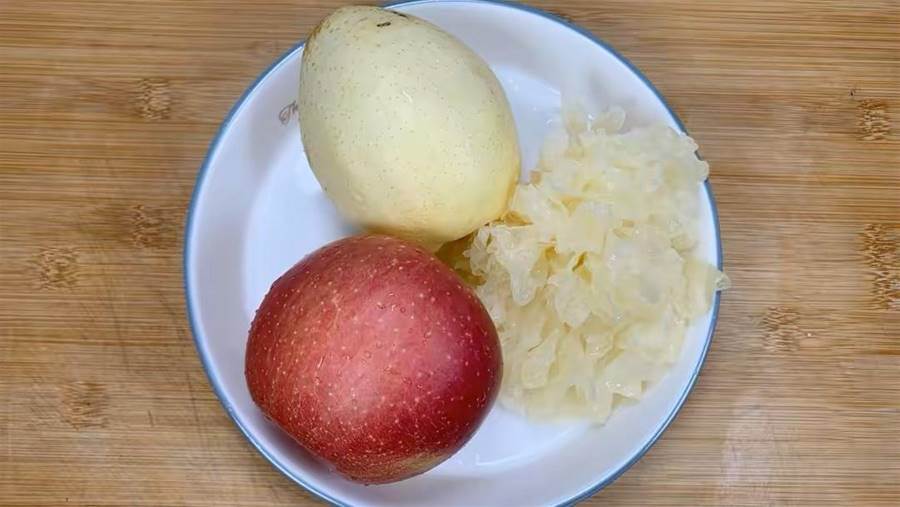 2、取一個煮鍋先把銀耳放入,倒入適量的清水,中小火把銀耳煮20分鐘,然后再放入提前切好的蘋果塊和雪梨塊,中小火繼續煮20分鐘,把雪梨和蘋果煮熟,出鍋前撒入枸杞再煮2分鐘關火就可以。