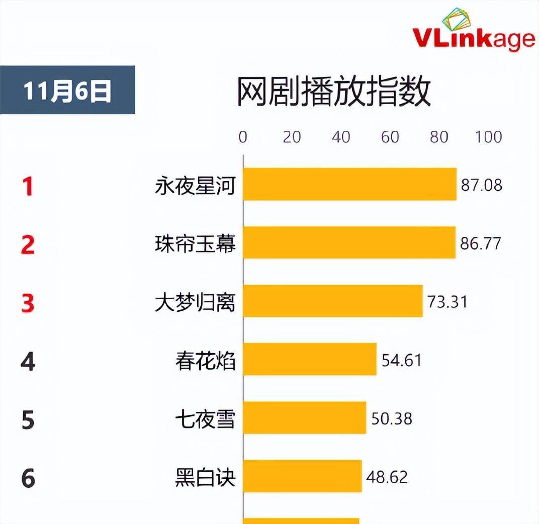 最新一期的網劇播放指數排名(簡稱網劇播放排名)來了,《永夜星河》登頂,位列第一,《珠簾玉幕》排第二,《大夢歸離》位列第三,《春花焰》位列第四,《七夜雪》位列第五,《黑白決》排在第六,不知道小伙伴們在追哪幾部劇呢?